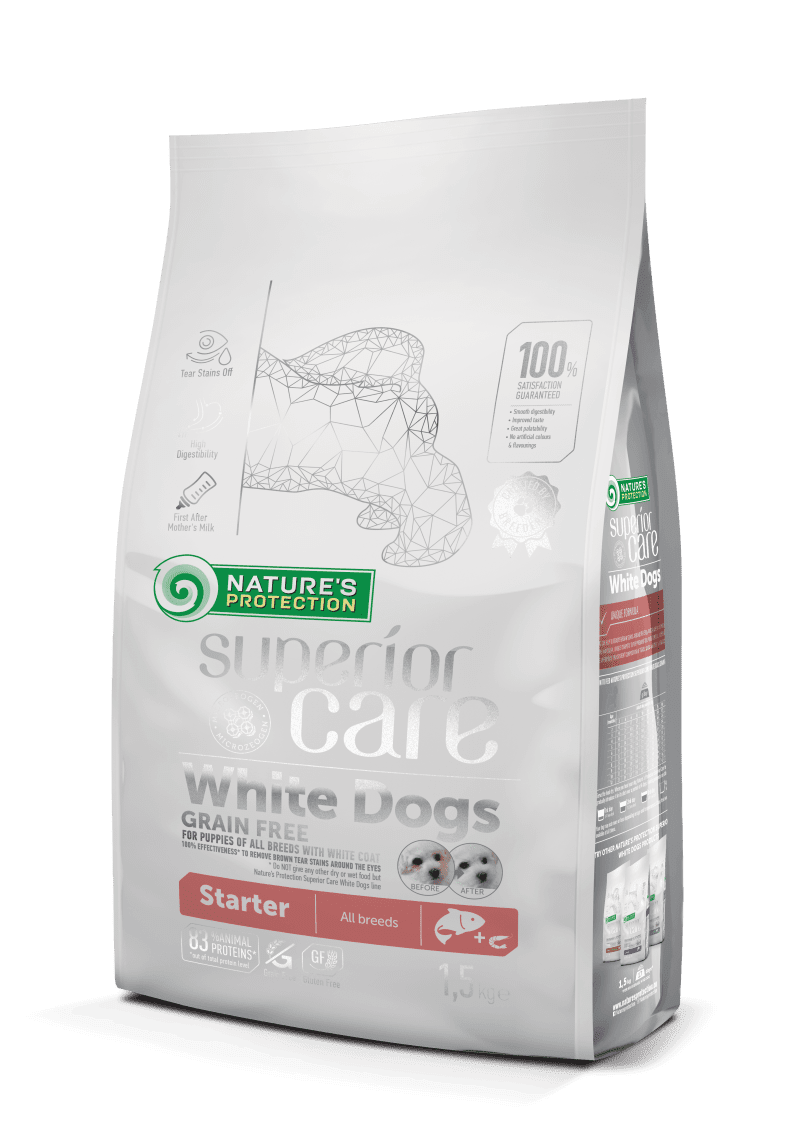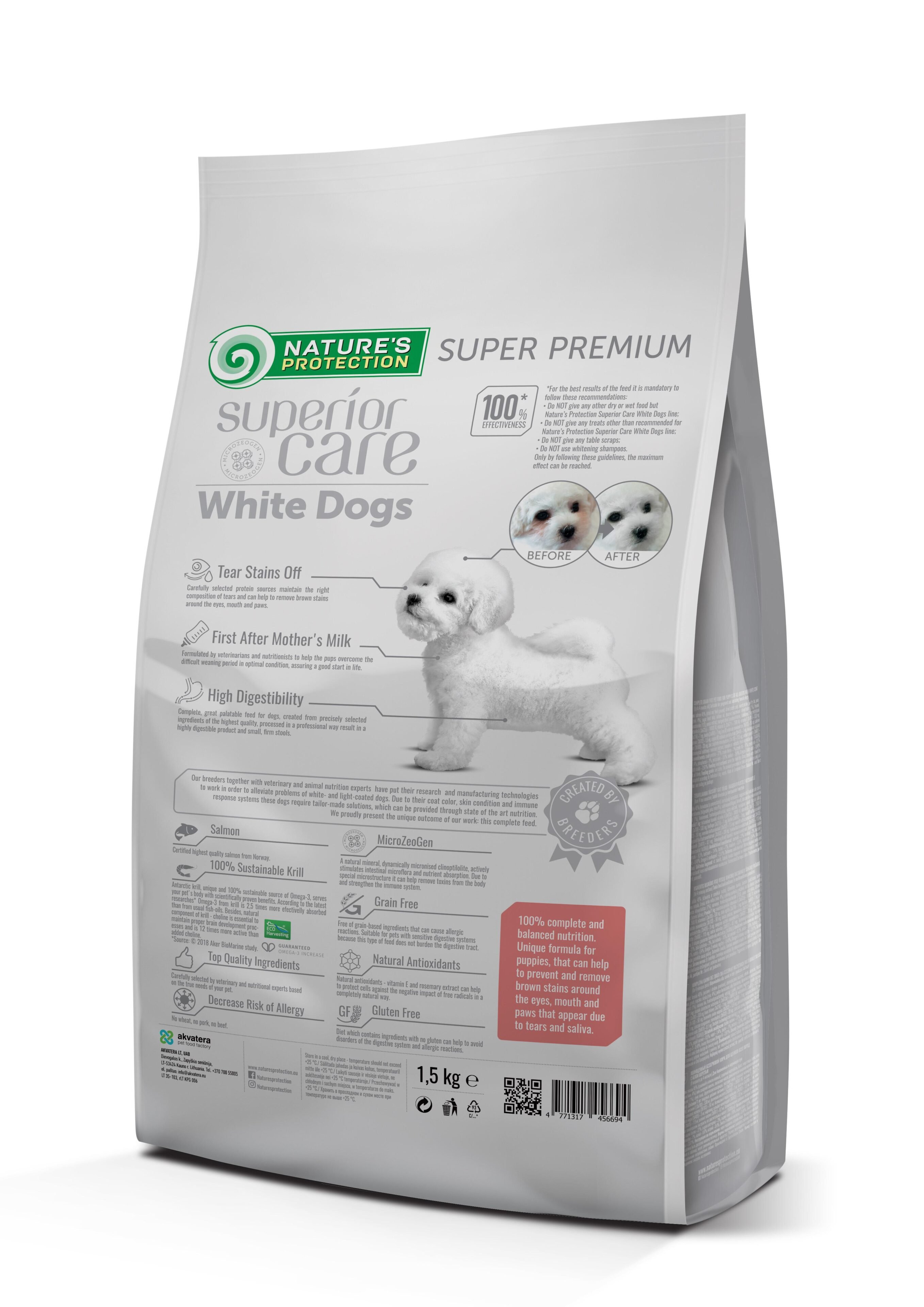 Nature‘s Superior Care White Dogs Grain Free with Salmon for Starter All Breeds est réputé pour sa composition équilibrée et ses matières premières, qui peuvent aider à lutter contre les taches de larmes brunes et à garder une peau et un pelage sains.La principale source de protéines de cet aliment sec complet pour chiens est le saumon, riche en acides gras oméga, qui contribuent à renforcer le système immunitaire et à favoriser un développement sain. Il contient également du krill antarctique, une source unique et 100% durable d’oméga-3 et de choline, qui favorise une croissance saine, un bon développement du cerveau et un bien-être général.