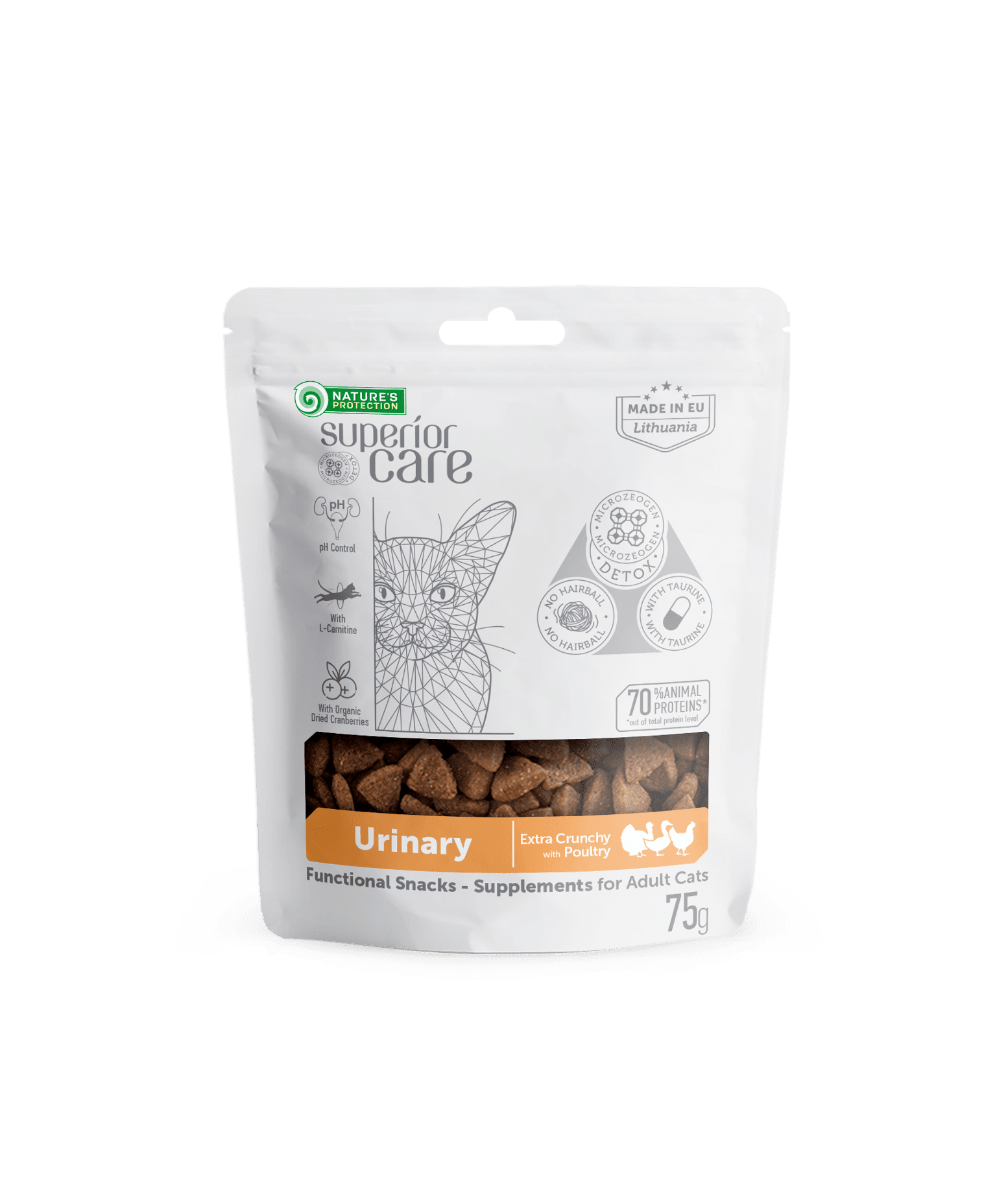 Nature’s Protection Superior Care Urinary supplemental snacks are perfect for a pet’s overall well-being and urinary system support. The main protein source of these snacks is poultry. It can be an excellent source of high-quality and highly digestible protein for cats. It contains the essential amino acids needed to maintain and strengthen strong muscles, skin and coat. Poultry is also rich in vitamins and minerals such as vitamin B12, iron and zinc, which are important for overall health and well-being. Poultry tastes good to cats, which promotes good palatability. The texture and shape of the treats are designed to help maintain good dental hygiene. Supplemental snacks are enriched with clinoptilolite of volcanic origin from nature – MicroZeoGen, which helps to remove toxins and improve nutrient absorption. The composition contains ingredients such as organic dried cranberries, Dl – methionine that helps to prevent urinary tract problems.