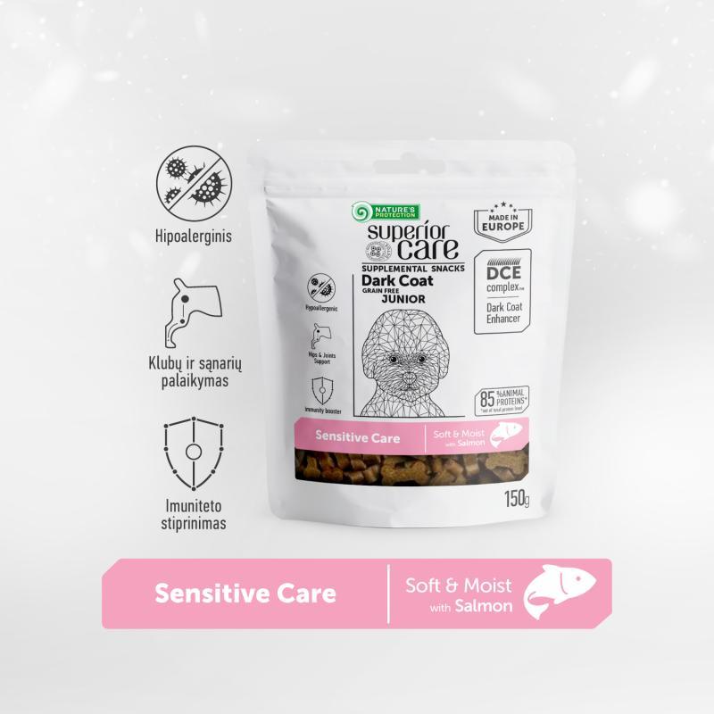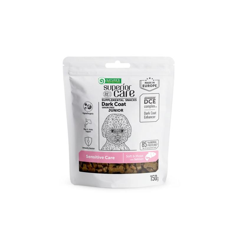 Nature’s Protection Superior Care Dark Coat is a high-quality, grain-free supplemental treats crafted with salmon, perfect for junior, dark-coated dogs of all breeds. Specially formulated for dogs with sensitive digestion, it provides essential nutrients to promote a healthy, glossy coat and overall vitality. These delicious treats are not only easy to digest but also support your dog’s optimal growth and development, ensuring they stay happy, healthy, and full of energy.