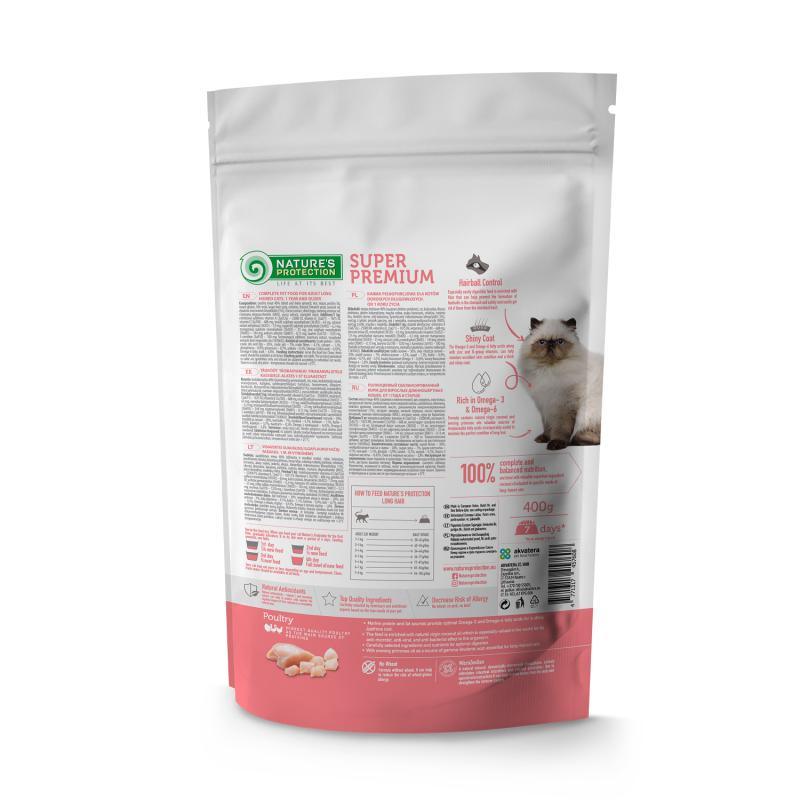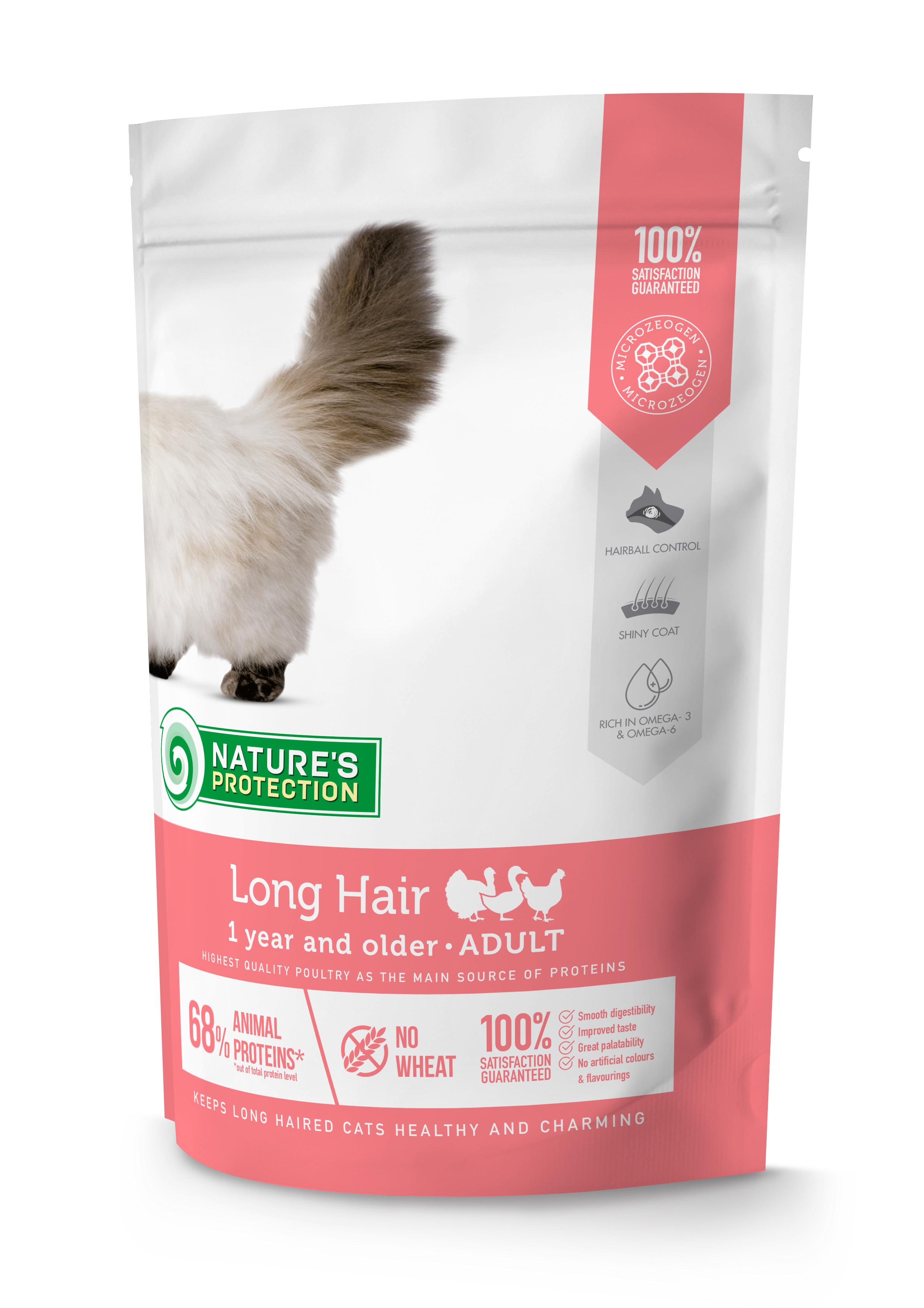 Nature’s Protection Long Hair for adult cats are created with ingredients that are perfect for providing the necessary amount of calories, vitamins and minerals for cats with long coat. The main protein source of this dry cat food is poultry. It is a high quality protein that is an excellent source of nutrition for cats, as it is packed with essential nutrients that can help promote good health. This dry food’s complete and balanced composition is enriched with natural supplements likeMicroZeoGen that help remove toxins from the body and support a healthy immune system. The composition is enriched with Omega-3 and Omega-6 fatty acids essential for healthy skin and coat conditions. As well as mono- and polyunsaturated fatty acids support the immune system, while saturated fatty acids provide required energy. This cat food is also fiber-rich diet designed to aid in hairball control, promoting healthy digestion and ensuring the overall well-being of cats. All ingredients are carefully selected by veterinary and nutritional experts based on the true needs of your pet.