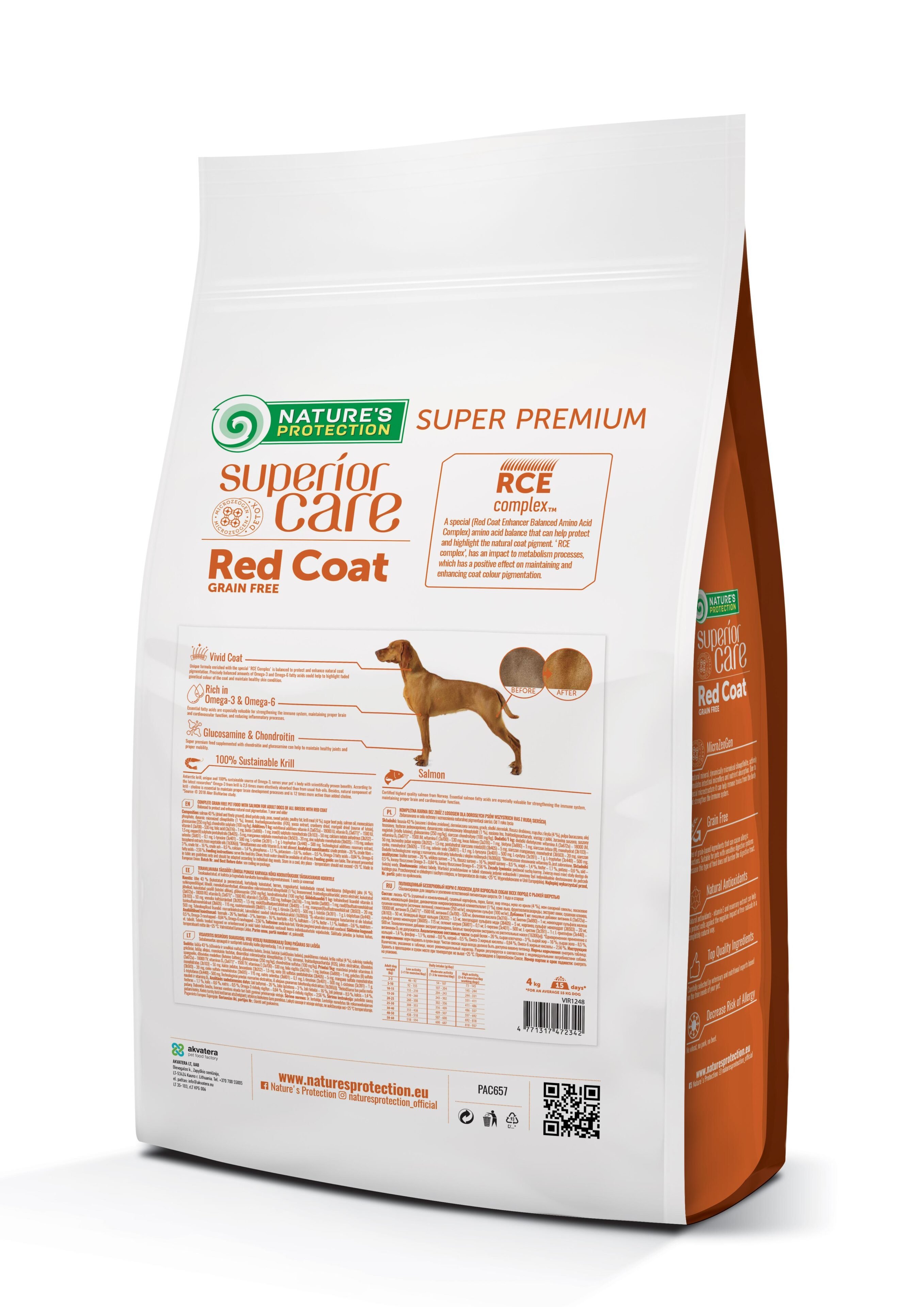 Nature’s Protection Red Coat Grain Free with Salmon for Adult All Breed dogs is well known for its RCE Complex(Red Coat Enhancer Balanced Amino Acid Complex), a balanced composition that helps protect and enhance the natural pigmentation of the brown and red coats and maintain the clear tiers and saliva composition. The main source of proteinin this dry dog food is Salmon. It is a high quality protein that is an excellent source of nutrition for dogs, as it is packed with essential nutrients that can help promote good health. It also contains an Antarctic krill, a unique and 100% sustainable source of Omega-3 and choline, which improves skin and coat condition, supports brain activity. The complete and balanced composition of this dry dog food is enriched with clinoptilolite of volcanic origin from nature – MicroZeoGen. It helps to remove toxins from the pet’s body and when it is detoxified the efficient nutrients, vitamins, and minerals easily absorb into the body. The composition is enriched with Glucosamine and Chondroitin which can help to keep a pet’s joints healthy and flexible at all times, strengthen tendons, ligaments, articular cartilage and spinal discs. As well mono- and polyunsaturated fatty acids support the immune system, while saturated fatty acids provide energy to a dog.