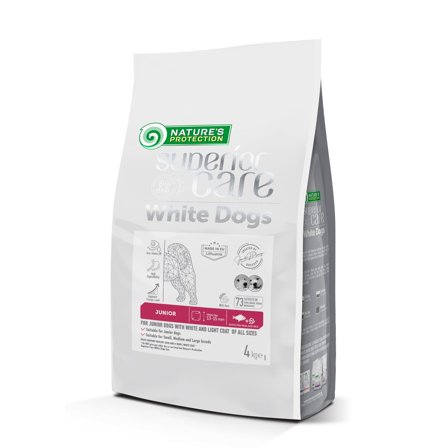 Nature’s Protection Superior Care dry pet food with White Fish for Junior Dogs of All Sizes and Life Stages with a White and Light–colored Coat is known for its well-balanced composition and raw materials. This feed kibble size is very versatile. Measuring 13-15 mm, it suits dogs of all sizes and ages. It is perfect for larger breeds who prefer eating smaller kibble, allowing them to eat more at once and improve their digestion system. For young dogs that love bigger kibble, it is a favorable choice to help them to learn properly chew and swallow feed. Chewing the kibble may help the dog maintain good dental health. This complete dry dog food fights against brown tears stains and keeps healthy skin and coat.